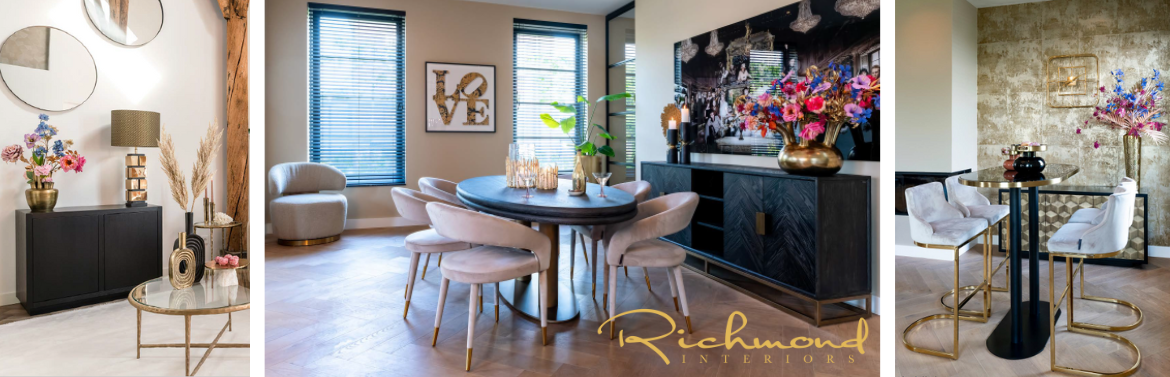 Richmond Interiors to holenderska marka oferująca luksusowe meble, lampy i dekoracje. Najwyżej jakości produkty wykonane np. ze 100-letniego drewna z recyklingu, szlachetne metale, wyjątkowe tkaniny, szkło i dużo złota! Richmond Interiors to klasa i elegancja, ponadczasowość i luksus!
